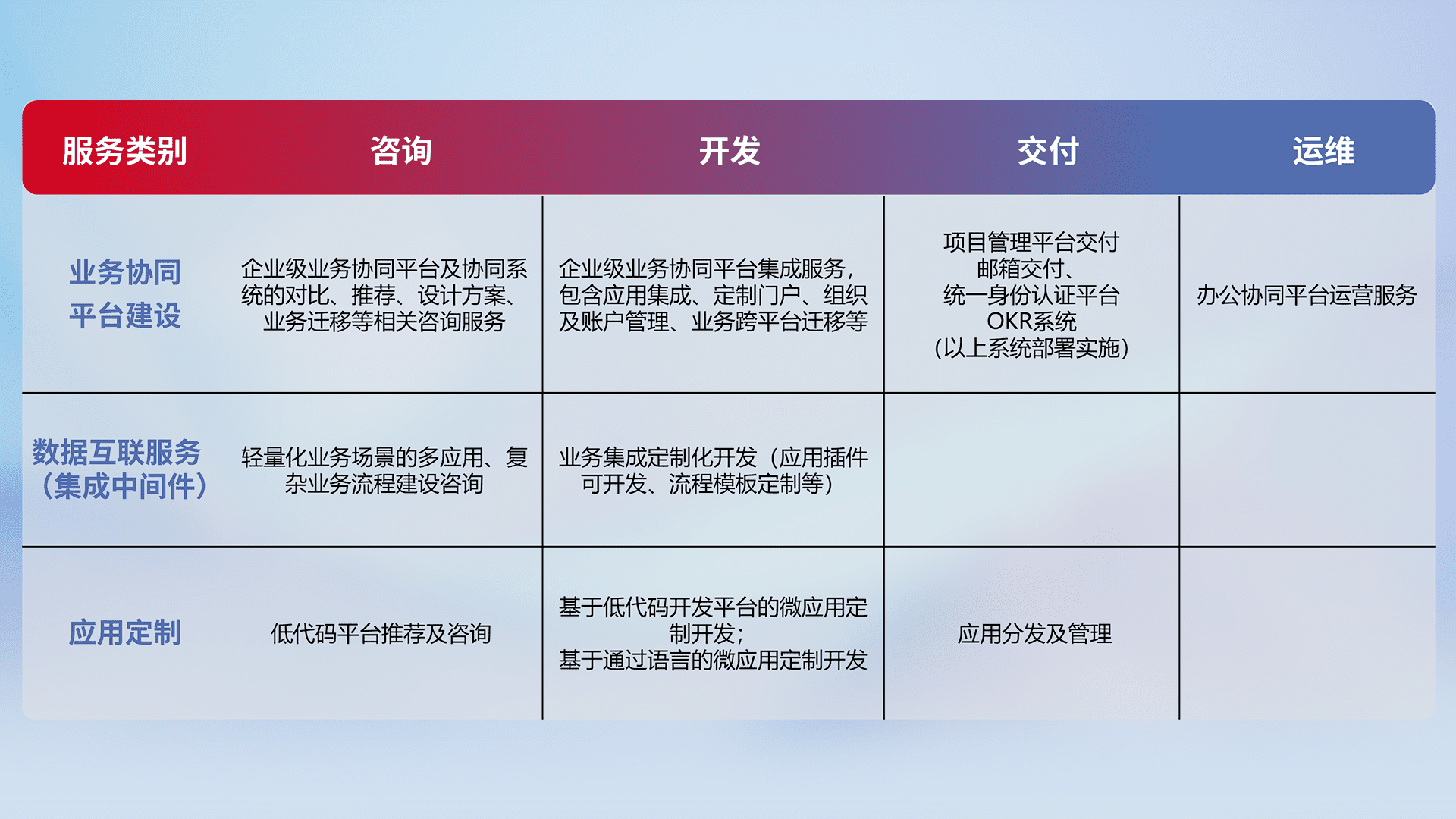 针对钉钉、、企微、、、IDaas等平台级产品提供产品的规划、、方案、、交付、、定制化开发等服务,,,,实现如统一协同办公、、智能客户服务、、混合会议管理、、、、智能数据查询、、、等业务场景,,,,实现数字化转型。。。。