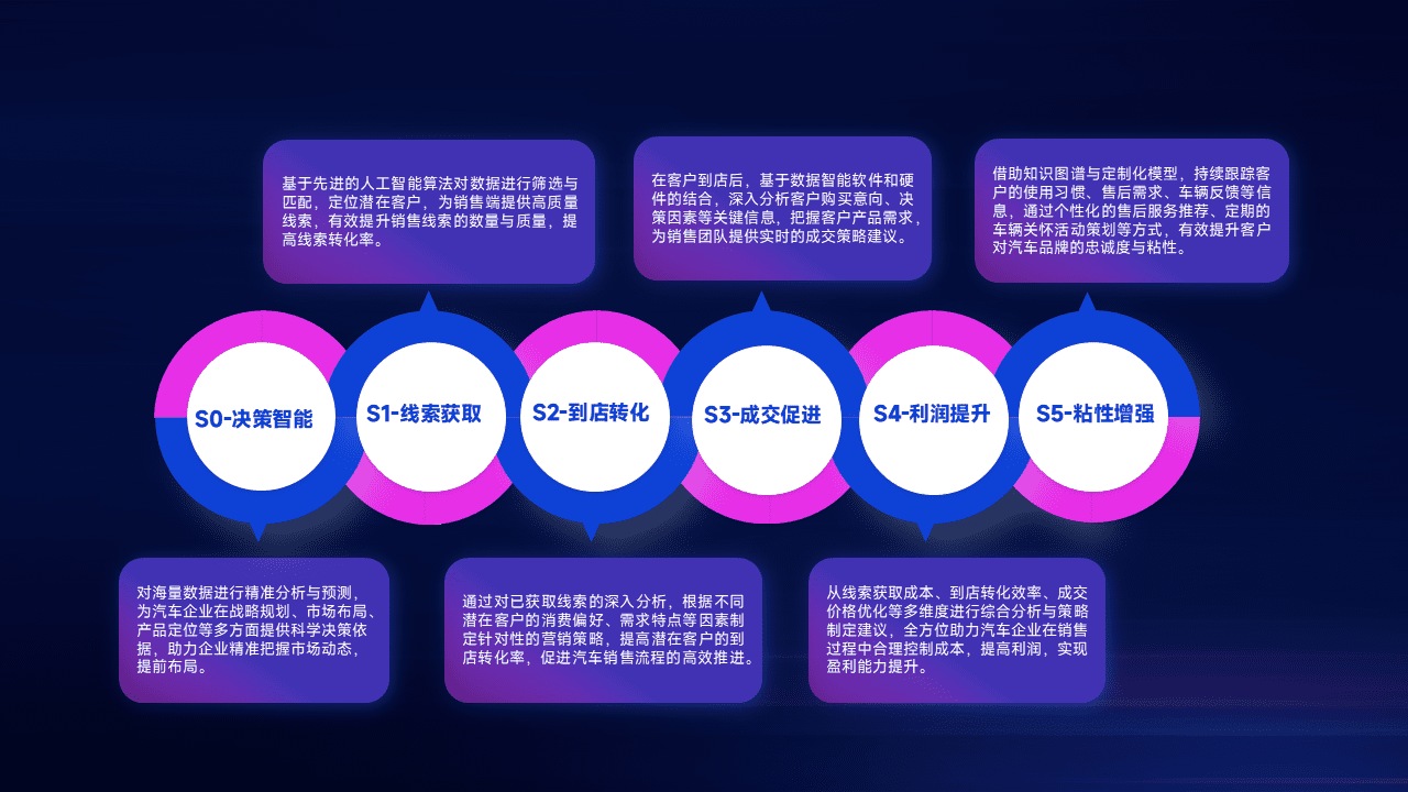 通过拓宽潜在客户来源、、、优化线索分配并提高到店转化率,,,以增强销售效率。。同时,,,利用线索数据不断优化分析模型,,,有效提升转化率,,,扩大营销影响力。。。